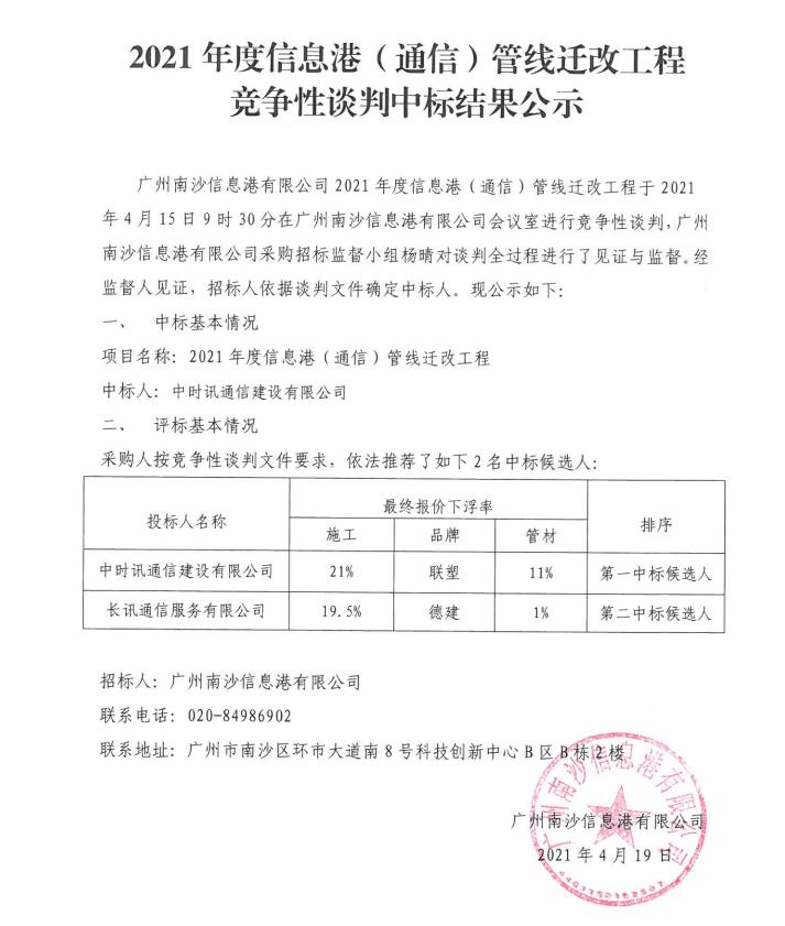 2021年度信息港(通信)管线迁改工程竞争性谈判中标结果公示