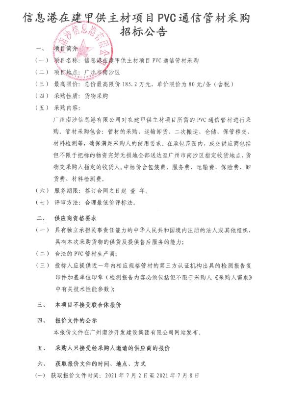 南沙信息港在建甲供主材项目PVC通信管材采购招标公告