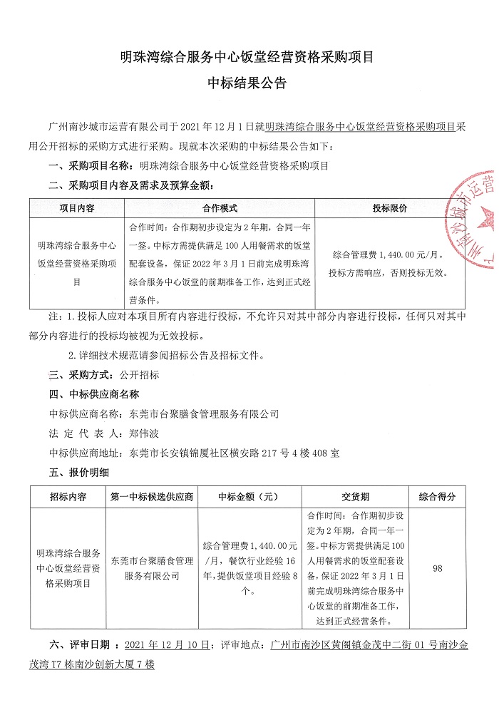 明珠湾综合服务中心饭堂经营资格采购项目中标结果公告