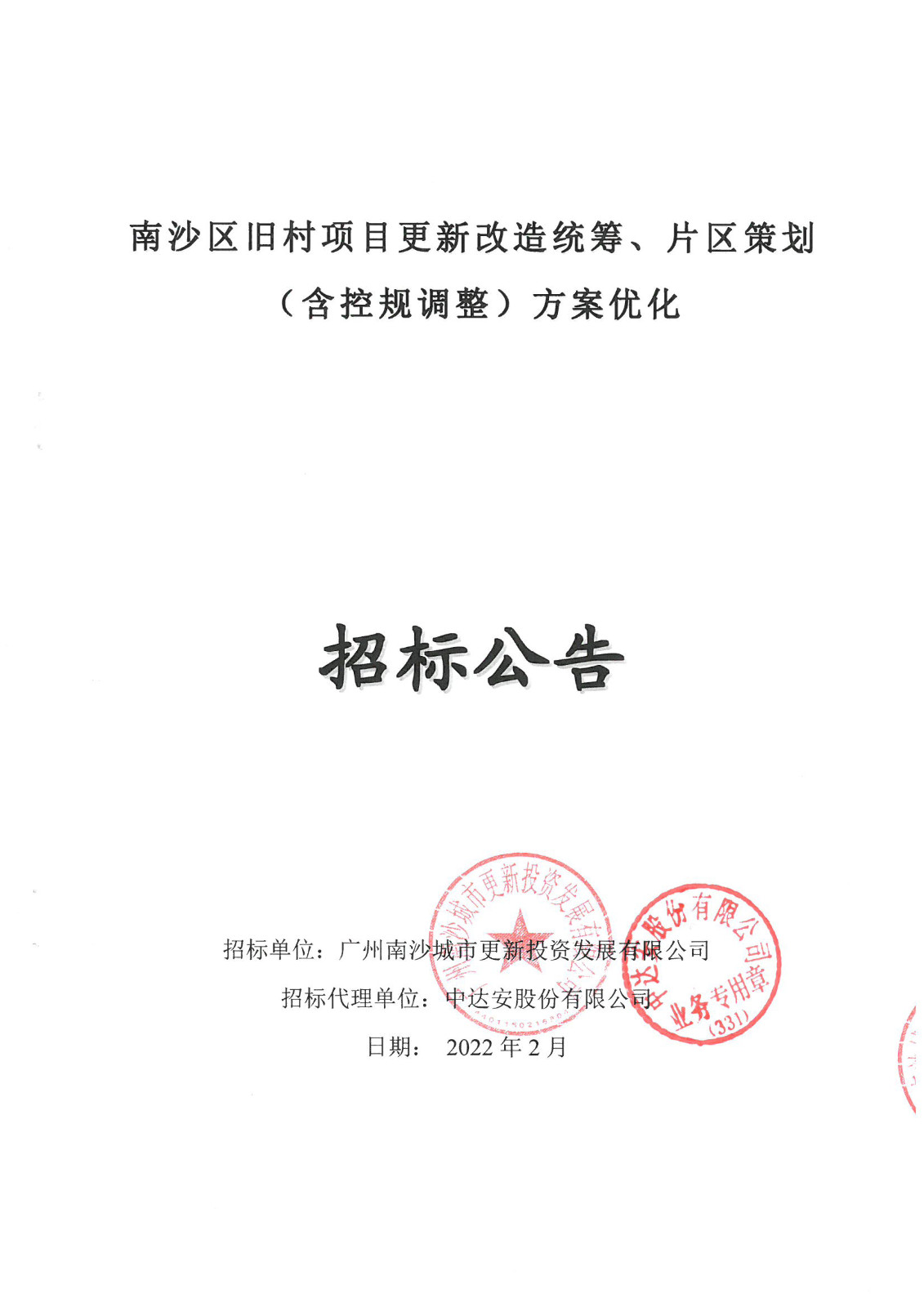 南沙区旧村项目更新改造统筹、片区策划(含控规调整)方案优化项目招标公告