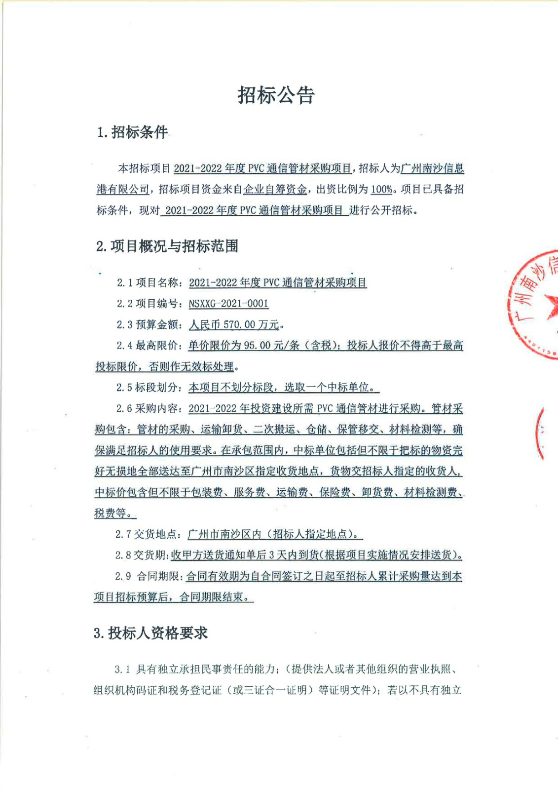 广州南沙信息港有限公司2021-2022年度PVC通信管材采购项目招标公告