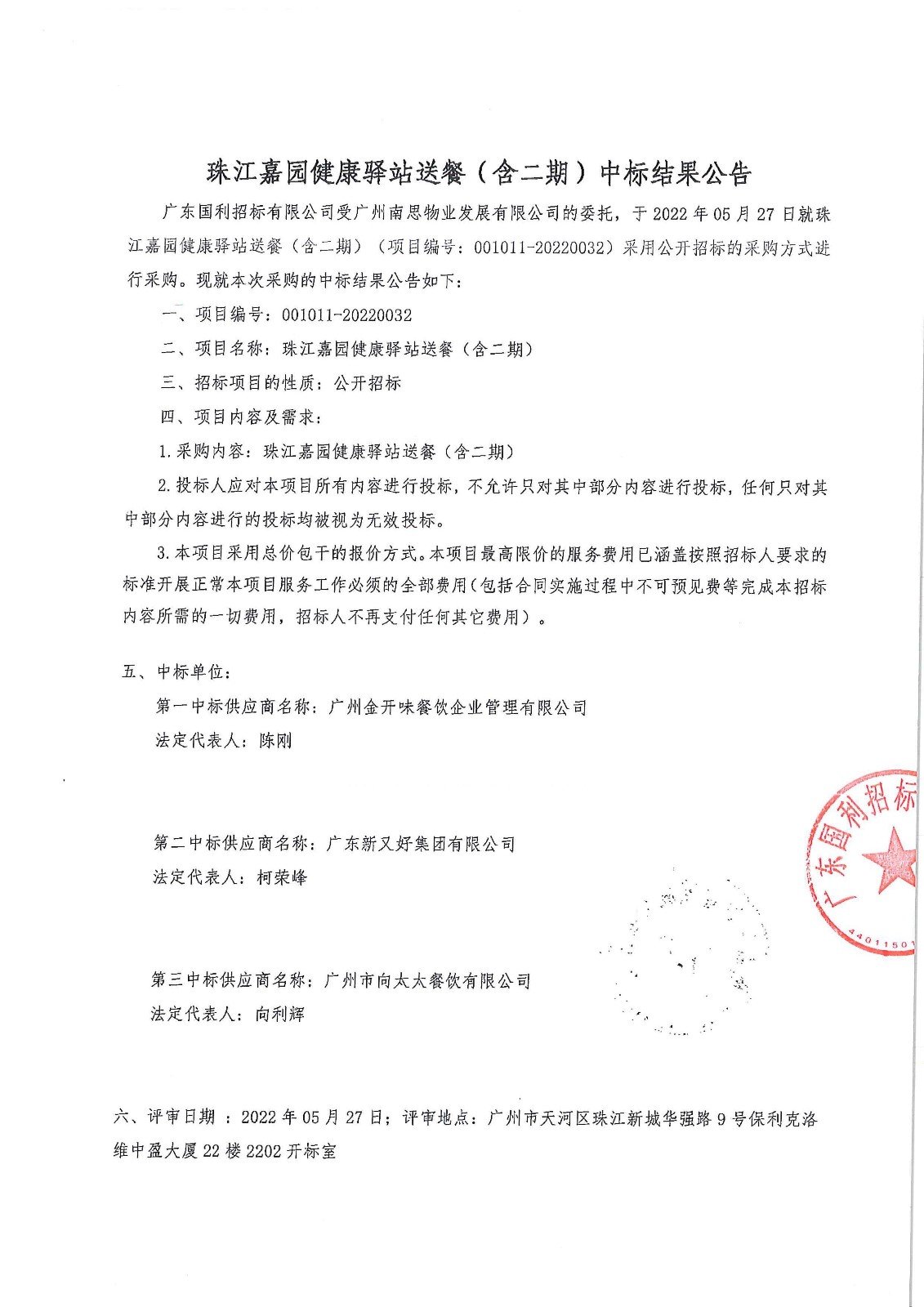 珠江嘉园健康驿站送餐(含二期)中标结果公告