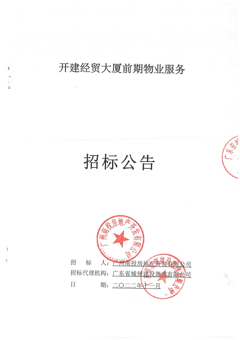 广州南投房地产开发有限公司开建经贸大厦前期物业服务招标公告