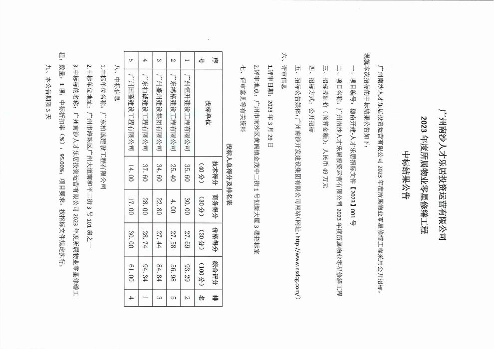 广州南沙人才乐居投资运营有限公司2023年度所属物业零星修缮工程中标结果公告