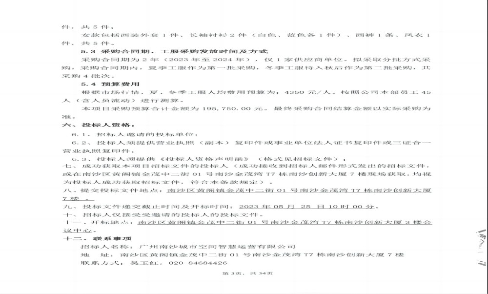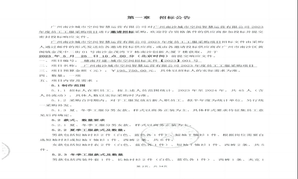 广州南沙城市空间智慧运营有限公司2023年度员工工服采购项目邀请招标公示