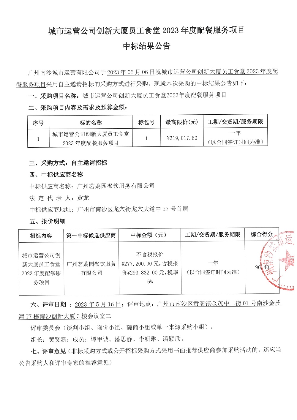城市运营公司创新大厦员工食堂2023年度配餐服务项目中标结果公告