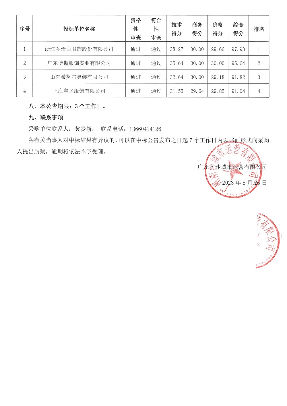 广州南沙城市运营有限公司2023年度员工工服采购项目中标结果公告