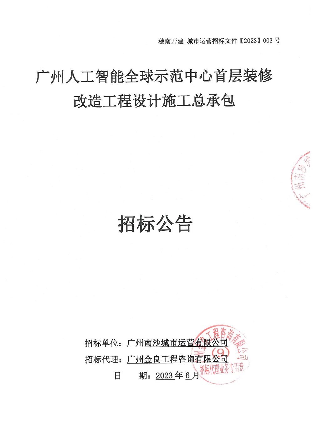 广州人工智能全球示范中心首层装修改造工程设计施工总承包招标公告