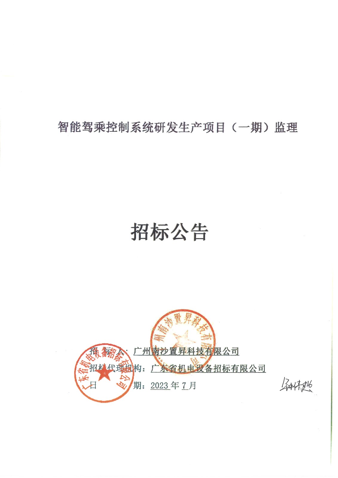 智能驾乘控制系统研发生产项目(一期)监理招标公告