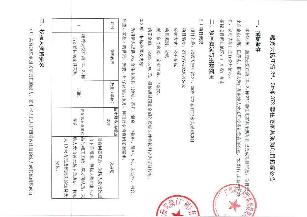 越秀天悦江湾2#、3#栋372套住宅家具采购项目招标公告