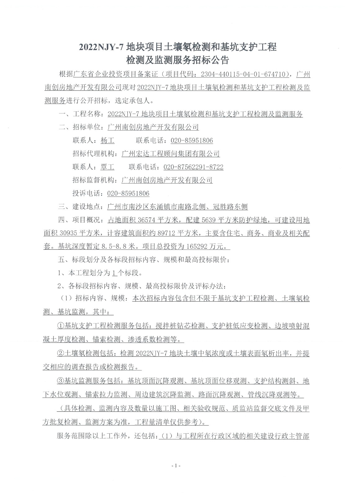 2022NJY-7地块项目土壤氡检测和基坑支护工程检测及监测服务招标公告