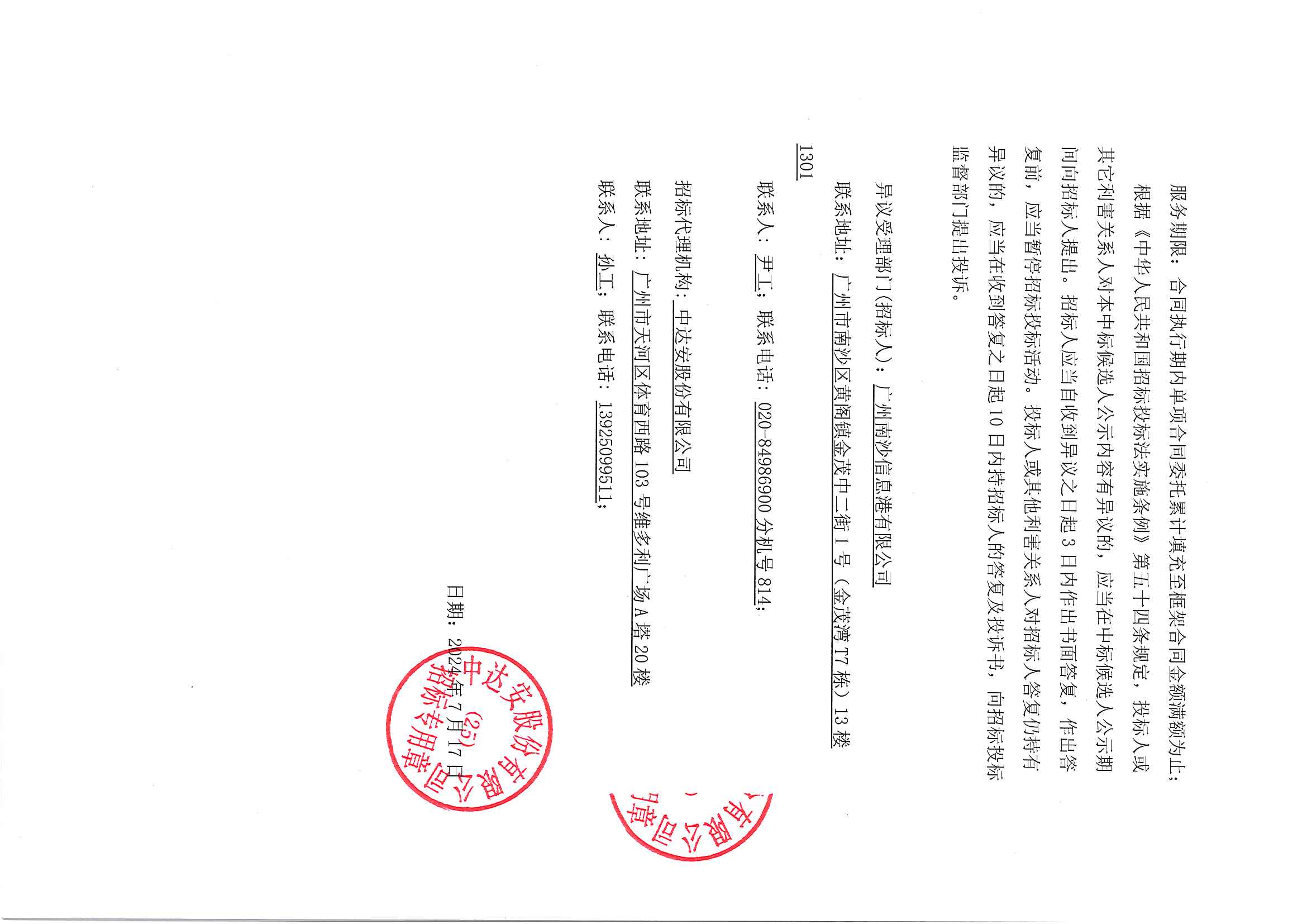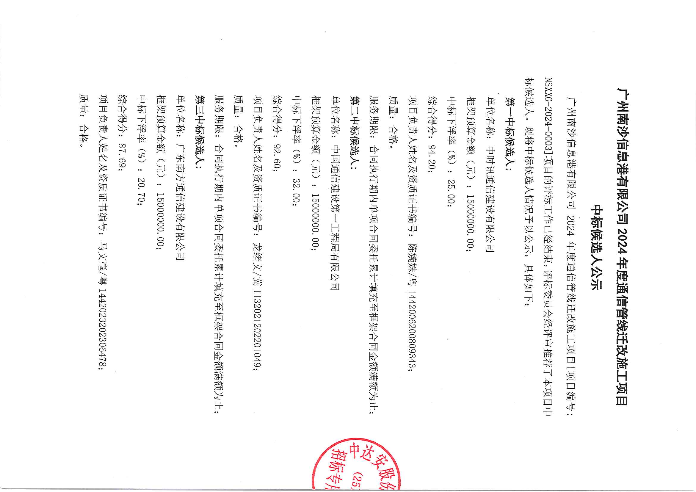 广州南沙信息港有限公司2024年度通信管线迁改施工项目中标候选人公示