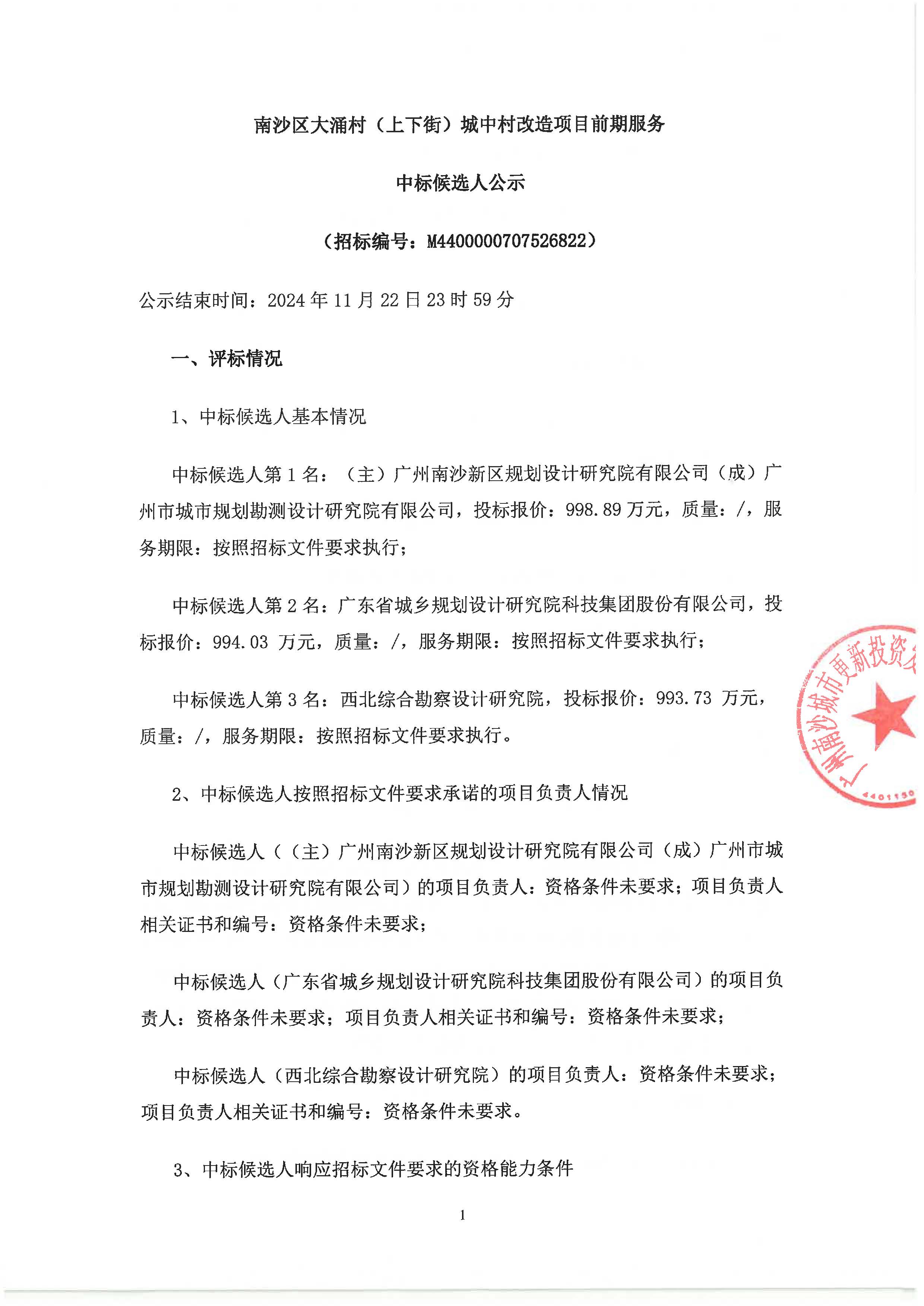 南沙区大涌村(上下街)城中村改造项目前期服务中标候选人公示