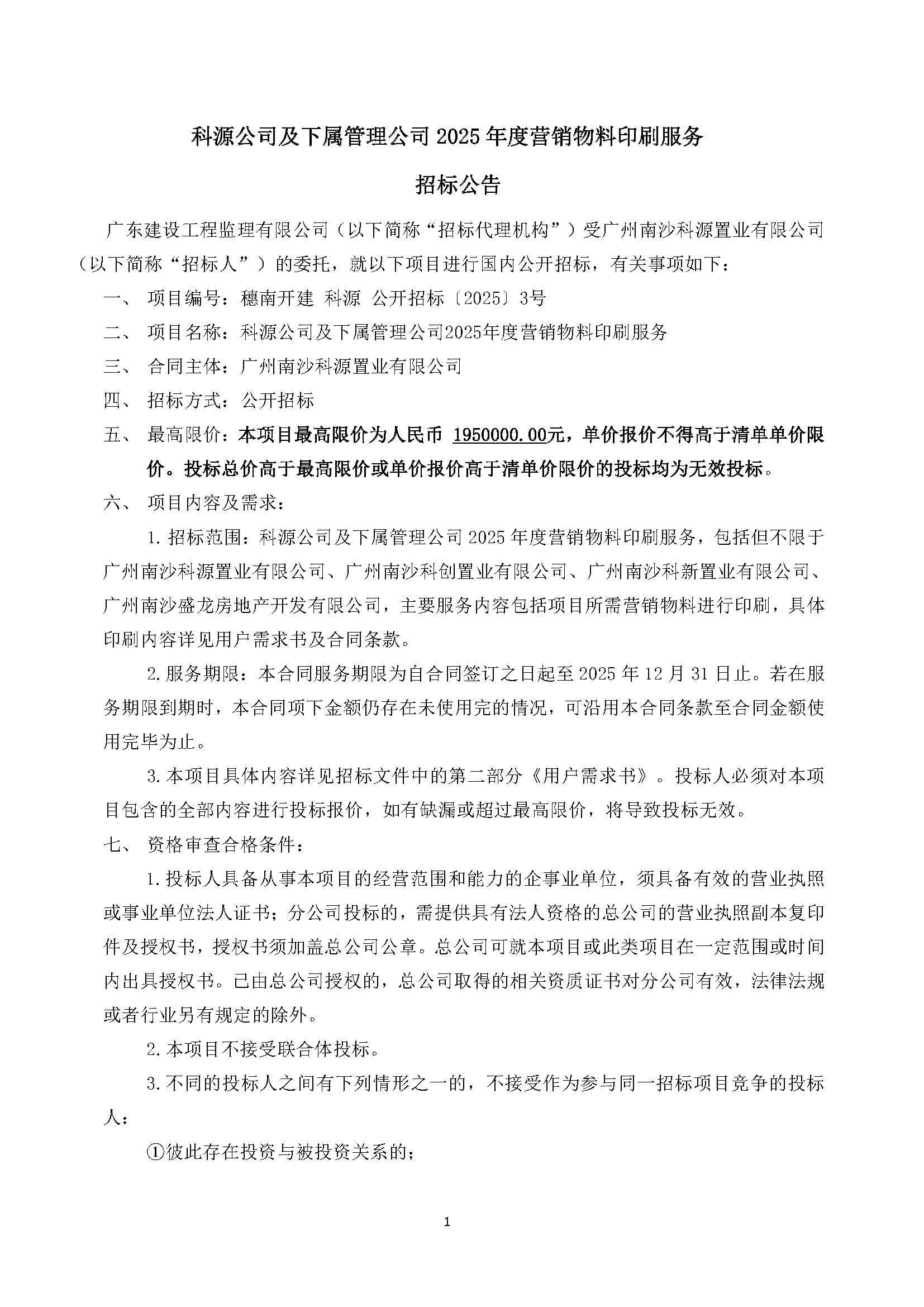 科源公司及下属管理公司2025年度营销物料印刷服务招标公告