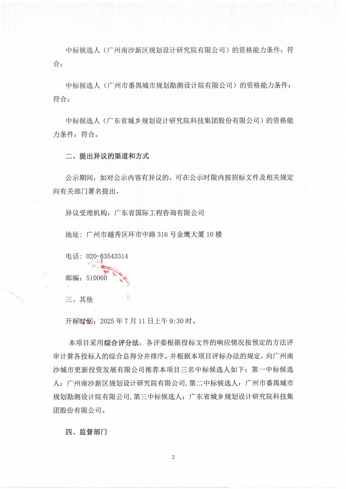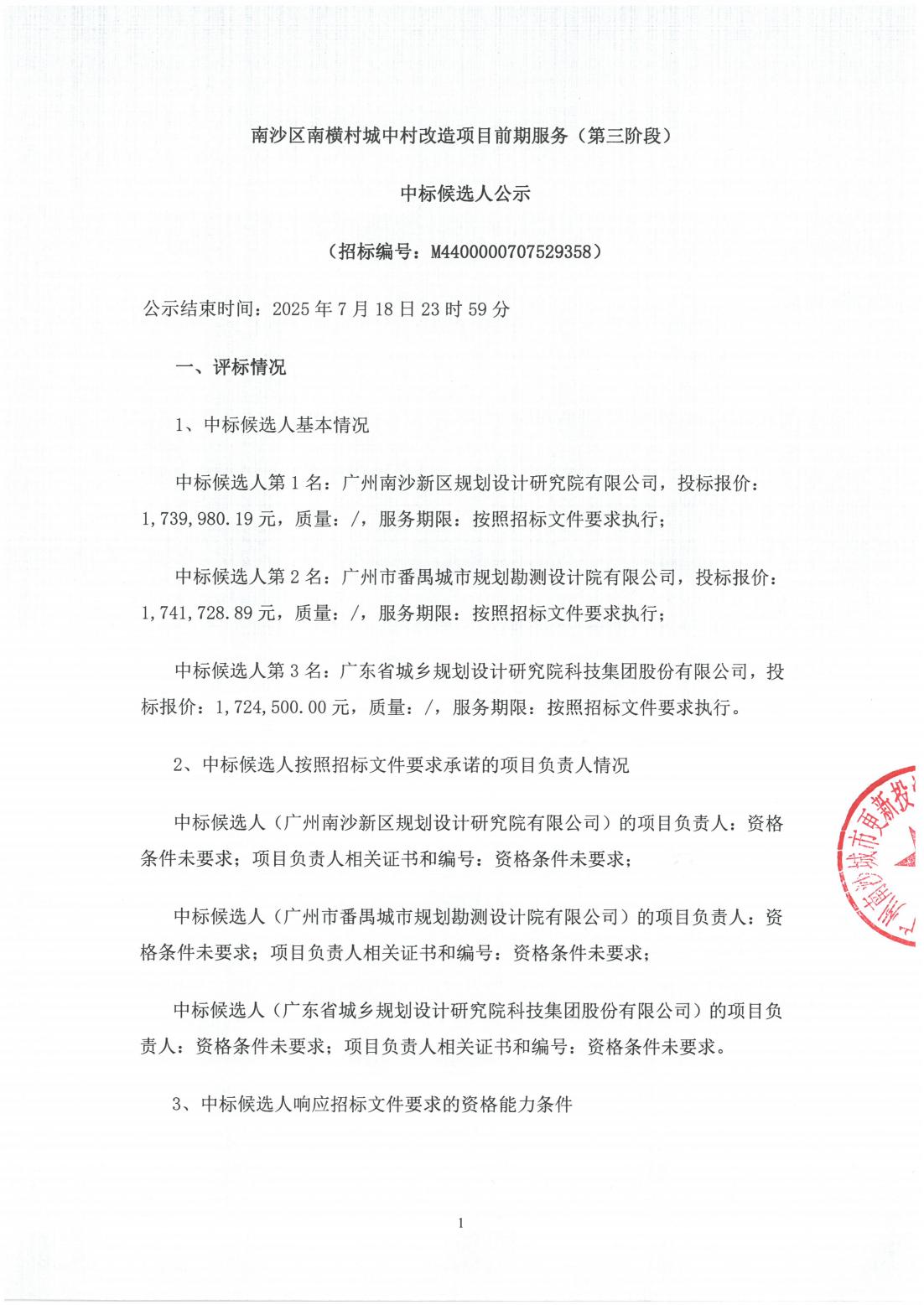 南沙区南横村城中村改造项目前期服务(第三阶段)中标候选人公示