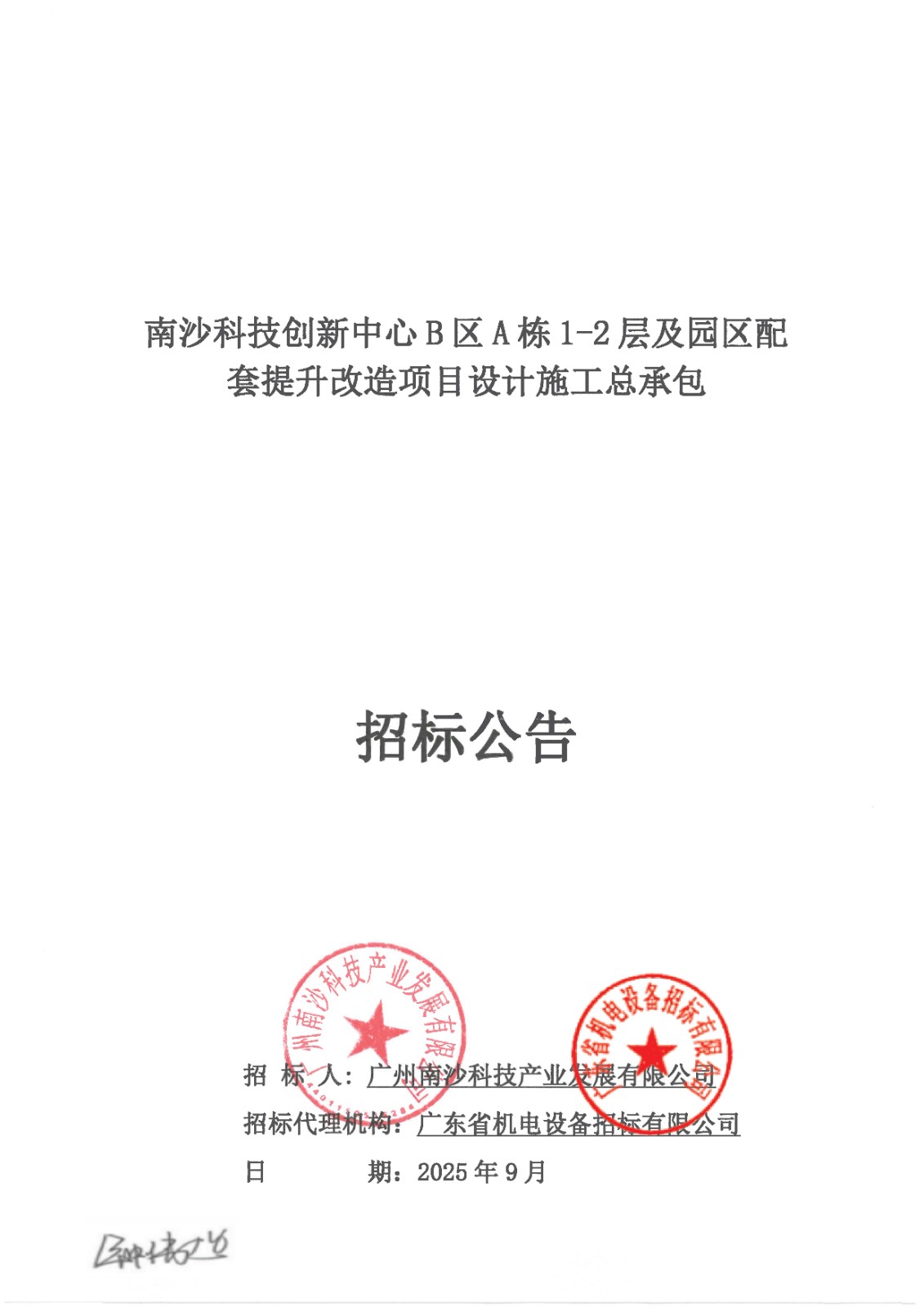 南沙科技创新中心B区A栋1-2层及园区配套提升改造项目设计施工总承包【招标公告】