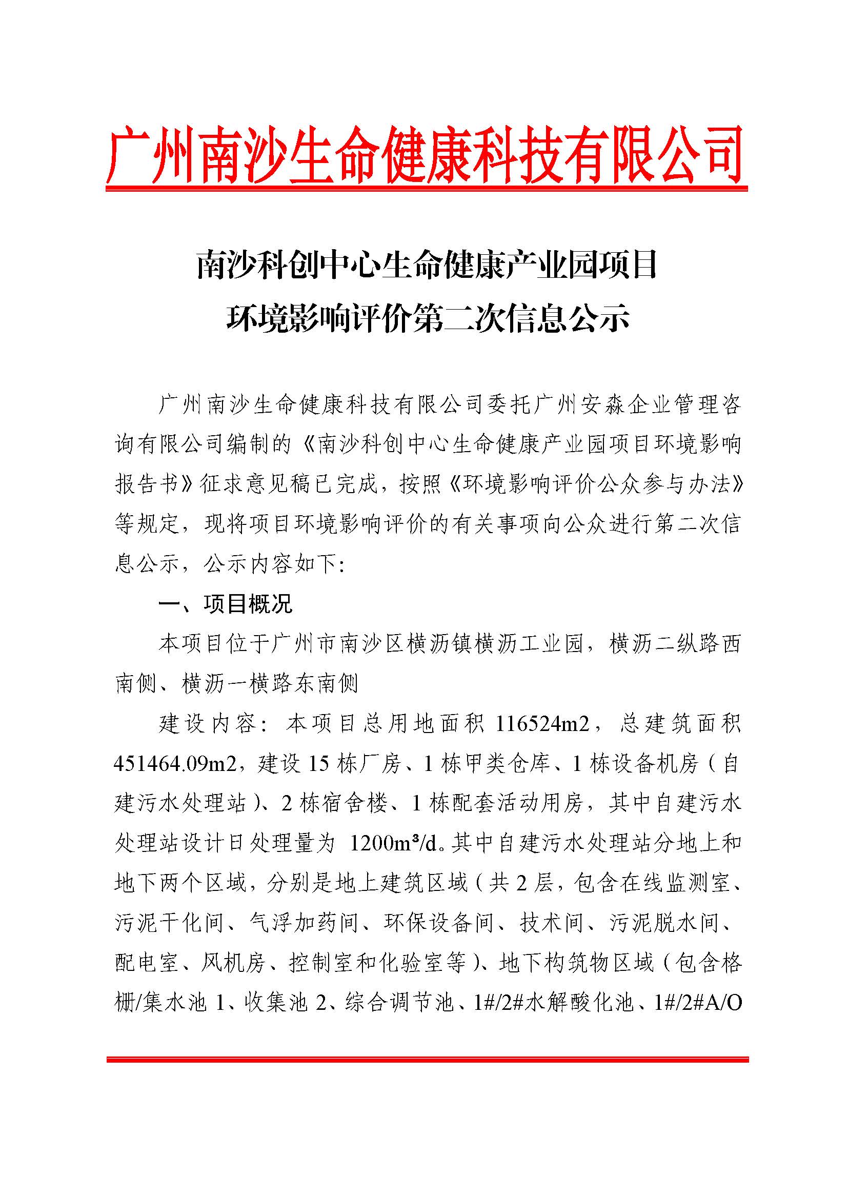 南沙科创中心生命健康产业园项目环境影响评价第二次信息公示