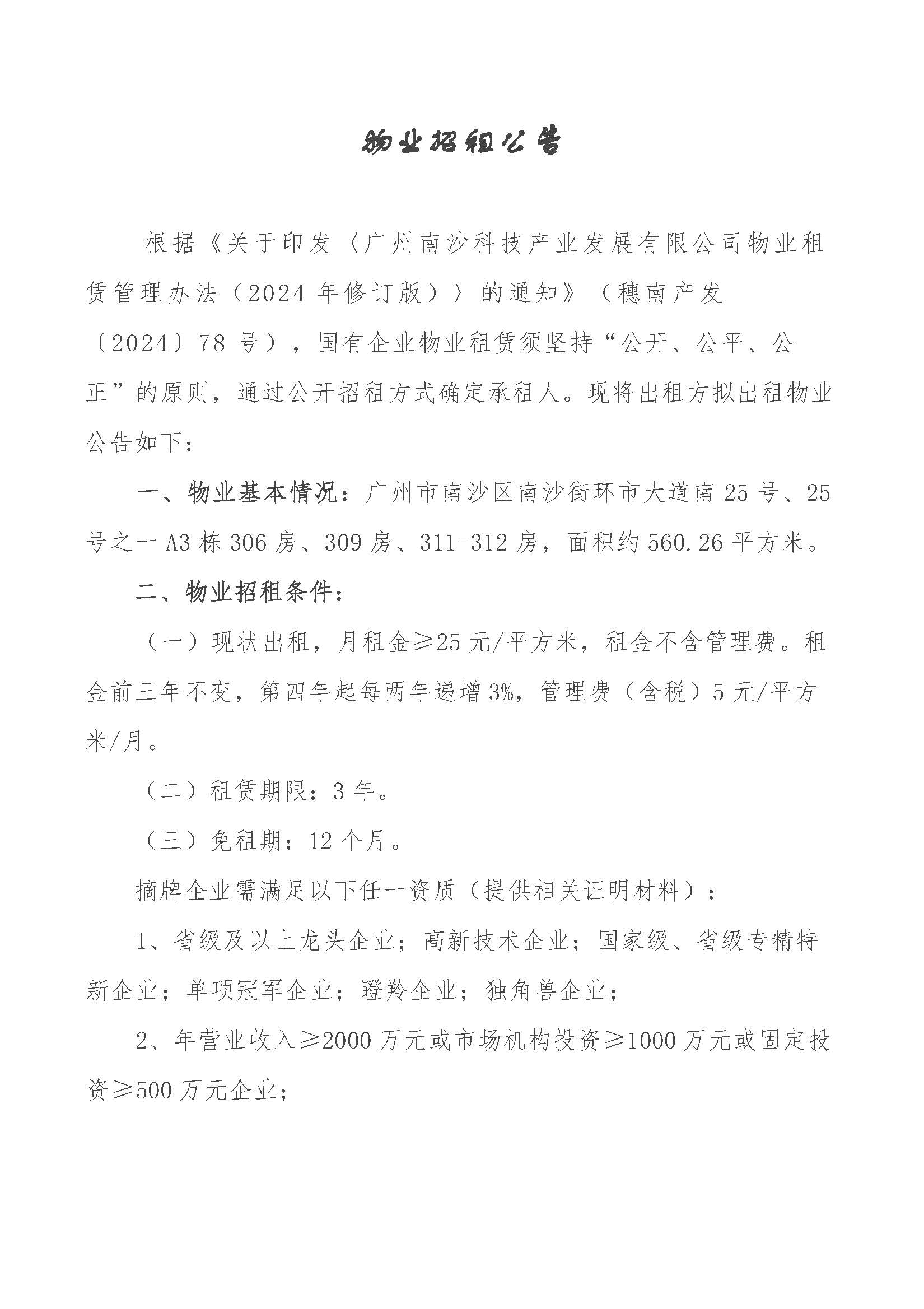物业招租公告-南沙留创园A3栋306房、309房、311-312房