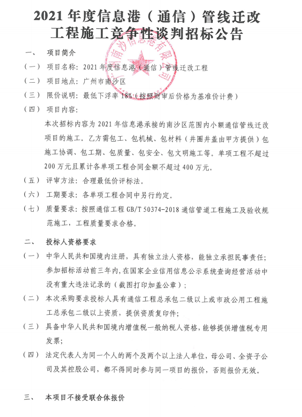 2021年度信息港(通信)管线迁改工程施工竞争性谈判招标公告