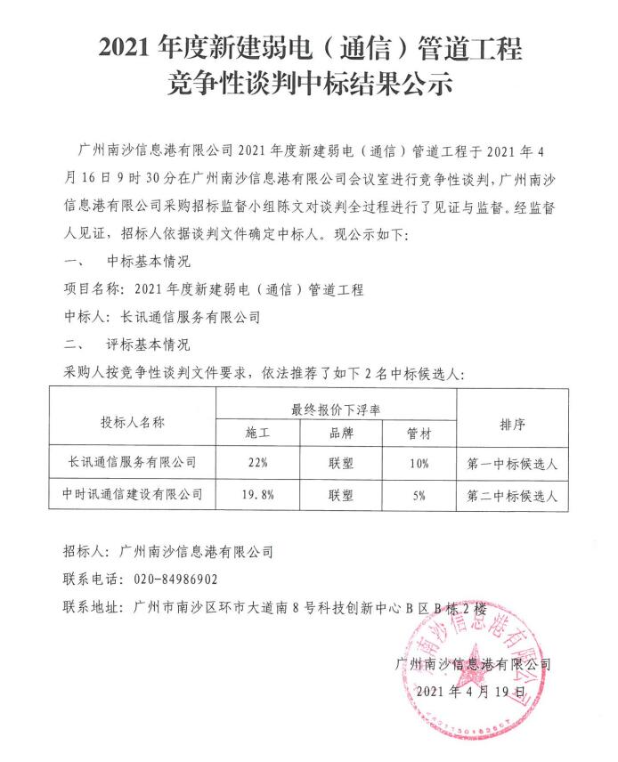 2021年度新建弱电(通信)管道工程竞争性谈判中标结果公示
