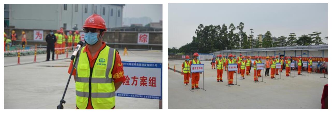 演练活动模拟因突降暴雨,河涌倒灌基坑,导致机械设备被淹等险情。应急救援指挥中心快速响应,组织一线抢险、物资保障等7个小组抢修重点部位,转移被困人员、设备。经过近1个小时的紧张抢险,11时50分,指挥中心宣布险情解除。