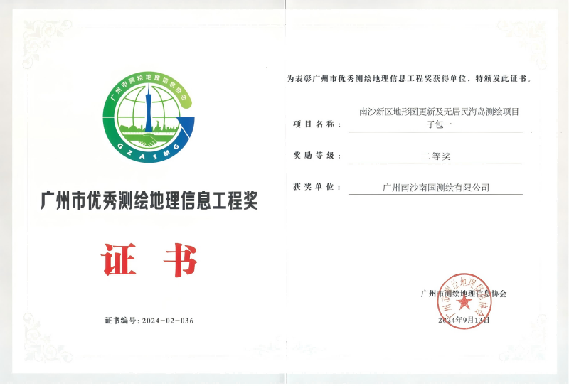 近日,新区规划院下属公司南国测绘公司参与完成的《南沙新区地形图更新及无居民海岛测绘项目》在第八届广州市优秀测绘地理信息工程奖评选中,荣获优秀测绘地理信息工程奖二等奖。